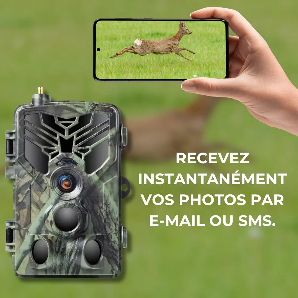 Caméra de chasse connectée et intelligente, équipée d’une antenne haute portée pour une transmission rapide des photos et vidéos directement sur votre téléphone.